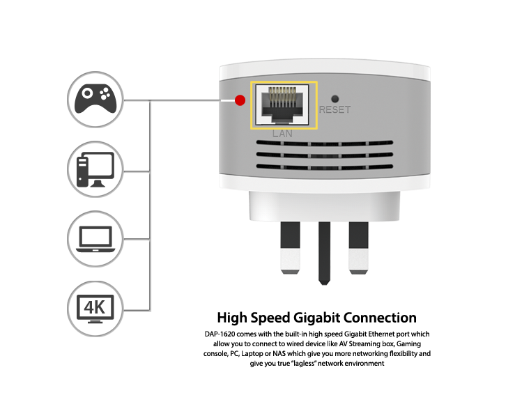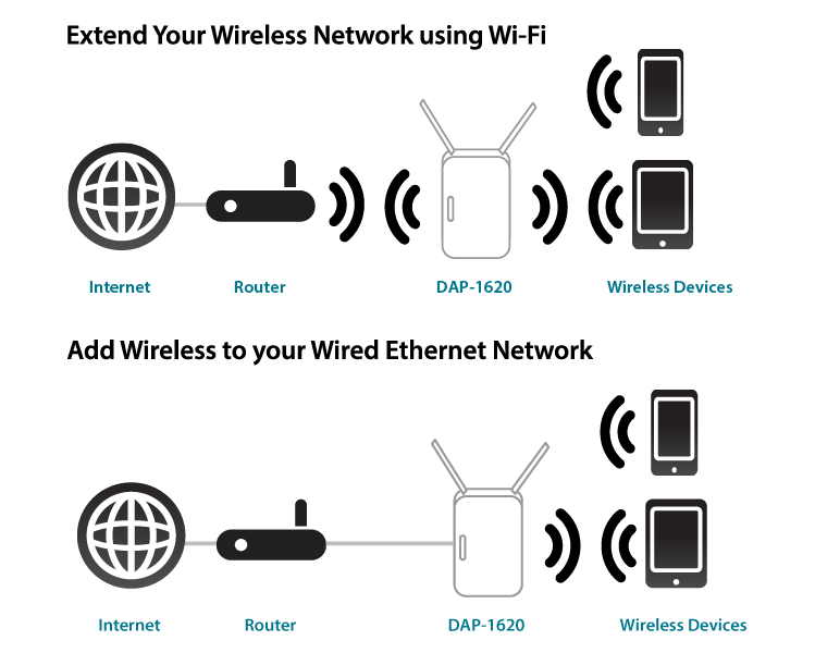 Bên cạnh chế độ mở rộng/lặp sóng Wi-Fi, bạn cũng có thể tùy chỉnh DAP-1620 trở thành điểm truy cập Access Point để mở rộng hệ thống mạng không dây trong nhà.